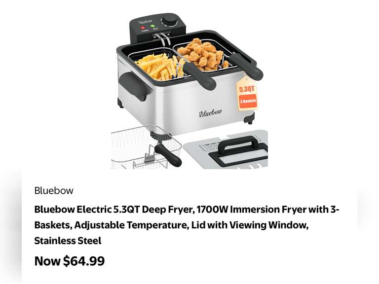LOT 1414 - Bluebow Electric 5.3QT Deep Fryer, 1700W Immersion Fryer with 3-Baskets, Adjustable Temperature, Lid