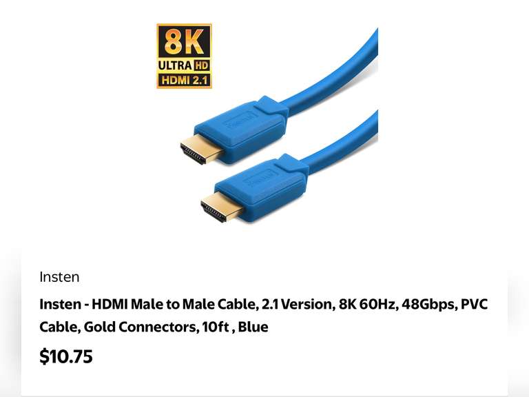 LOT 1531 - Insten - HDMI Male to Male Cable, 2.1 Version, 8K 60Hz, 48Gbps, PVC Cable, Gold Connectors, 10ft , B