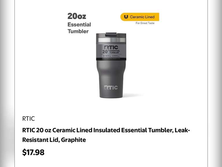 LOT 1536 - RTIC 20 oz Ceramic Lined Insulated Essential Tumbler, Leak-Resistant Lid, Graphite